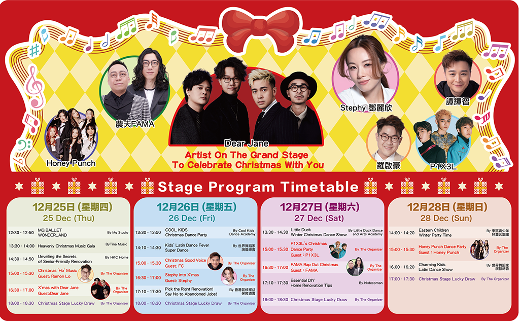 Exhibits include home furniture, famous mattress brands and bedroom products, massage chairs, home appliances, renovation materials etc. Apart from the stage programs providing information on house renovation and house inspection, there will be famous singers and celebrities celebrating Christmas with you!